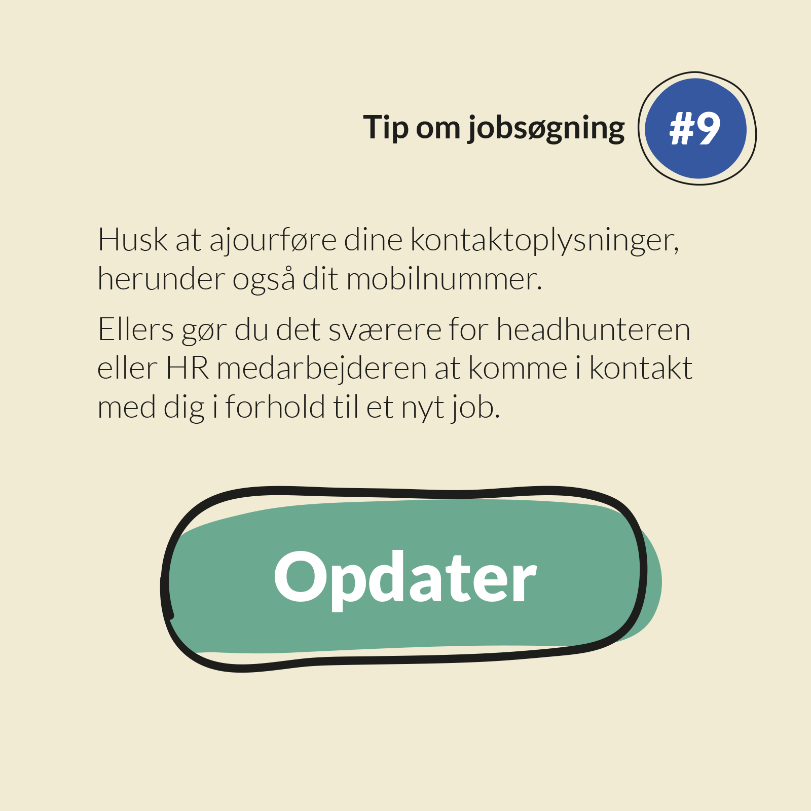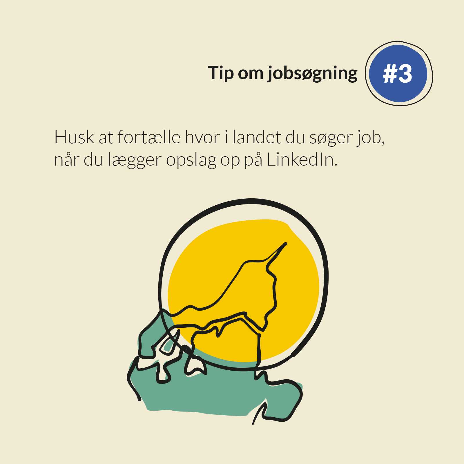 Husk at selvom dit nære netværk godt ved, hvor du bor, er næste led ikke informeret, når netværket spreder budskabet. Det er derfor vigtigt, at du skriver din geografi ind, når du på LinkedIn eller Facebook laver et opslag om, at du er jobsøgende.