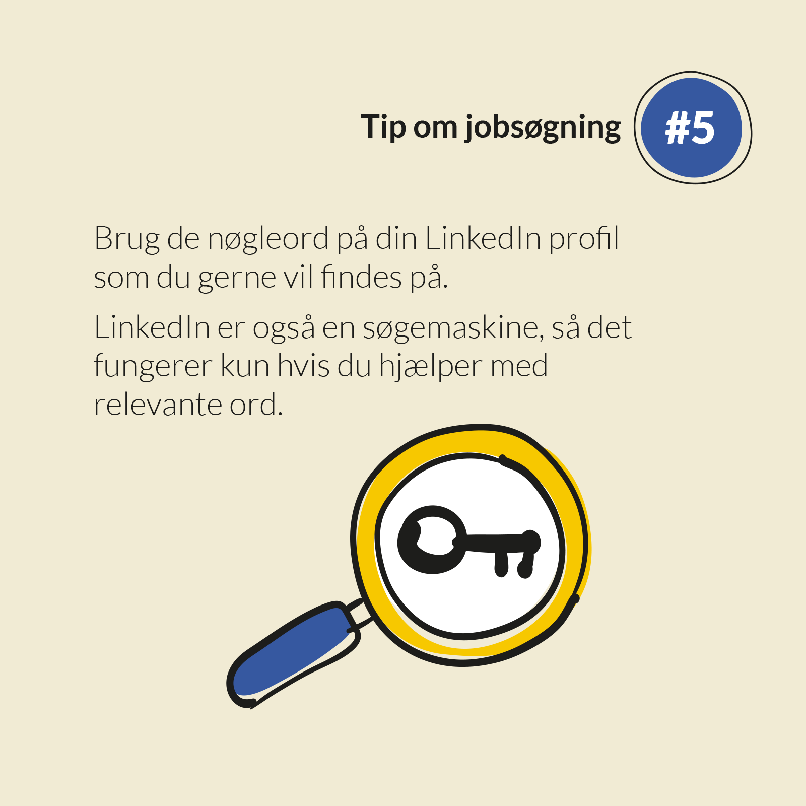 Når vi søger efter personer på de sociale medier bruger vi nogle søgeord. Det er samme princip, som når vi bruger Google til at finde information. Tænk over hvilke ord du gerne vil findes på.