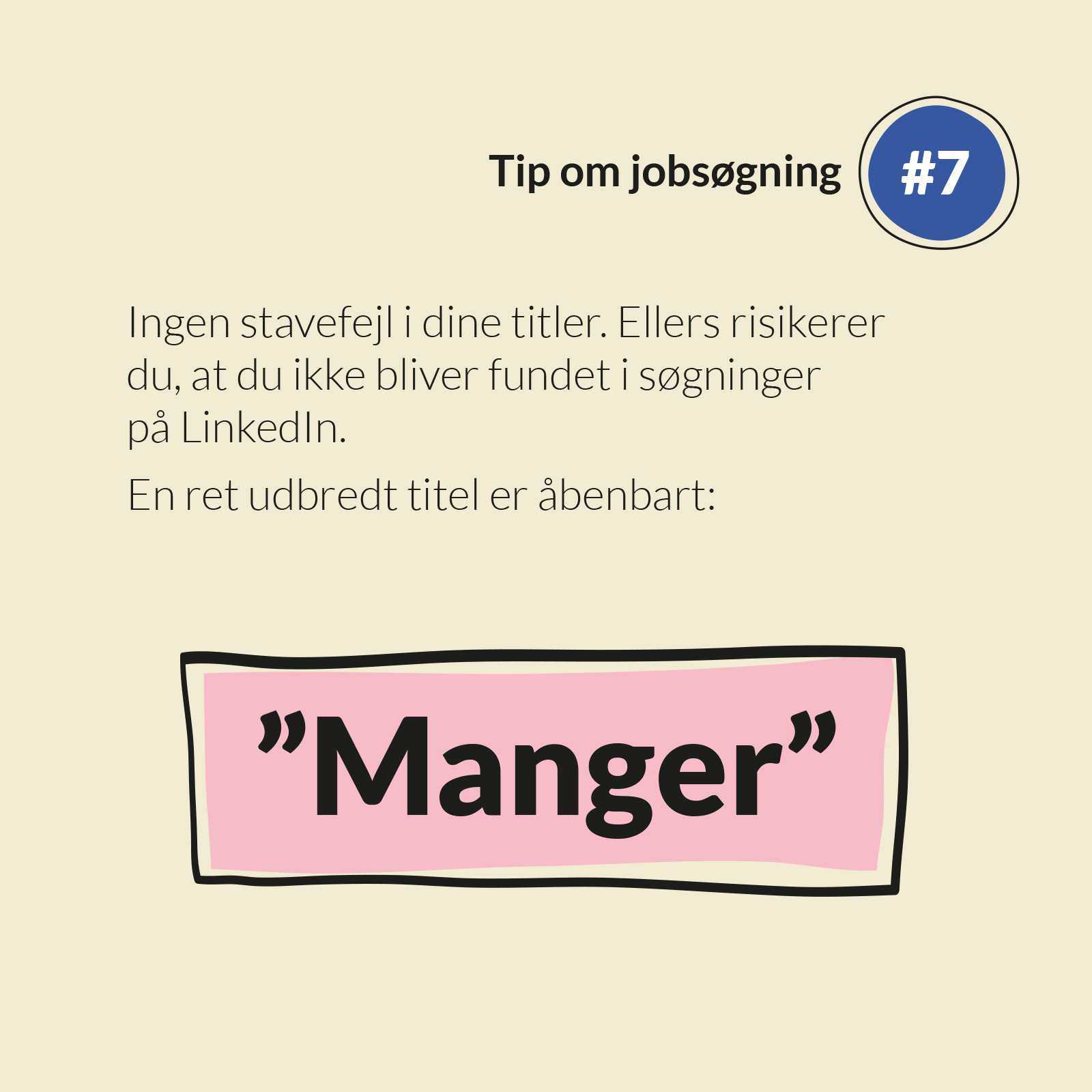 Husk også at der ofte søges på titler, så et enkelt manglende "a" gør f.eks, at man ikke bliver fundet som "manager". Der er 664.812 personer på LinkedIn med titlen "Manger".