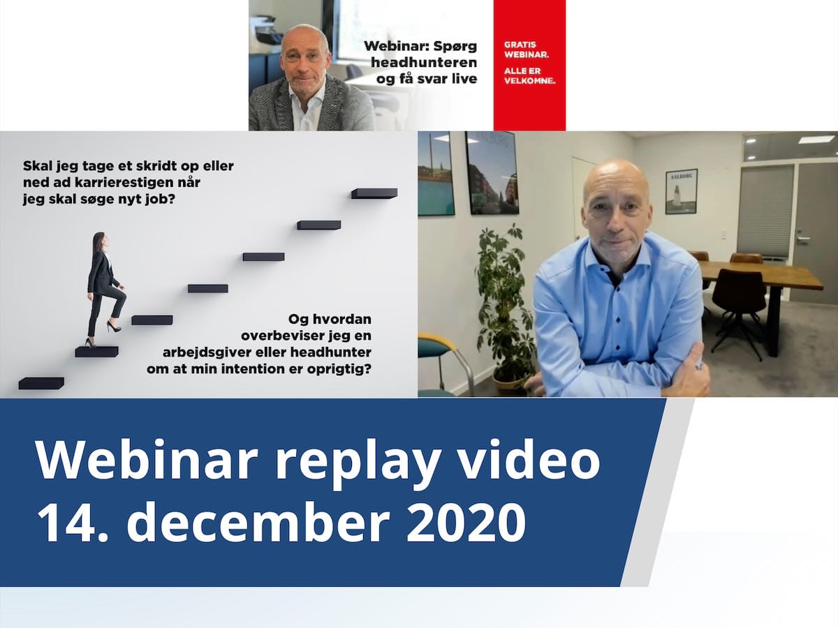 På webinaret den 14 december var temaet det, der ofte kaldes "Et trin op eller ned ad karrierestigen" Hvad betyder det egentligt - er det et skridt ned af karrierestigen, hvis du eksempelvis ikke længere vil have lederansvar men i stedet ønsker at gå specialistvejen? Nej det mener jeg bestemt ikke - det er måske et skridt op for dig, hvis du istedet beskæftiger dig med det du virkeligt brænder for. Men hvordan overbeviser du så en kommende arbejdsgiver om det?